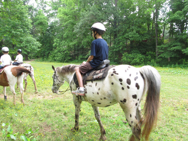 Today we were fortunate enough to spend the morning at a horse farm for a homeschool outing. The boys were pretty excited and slightly nervous...it had been quite some time since they were this close to a horse, but it didn't take long before they felt quite comfortable. I wasn't sure how MaKenna was going to do as she was afraid of horses, but I thought it would be a good opportunity to see other kids interacting with them without hesitation. She didn't want to pet the horses, or even go near them, at first, but by the time it was her turn to ride, she was pretty excited! Yay! I had a deep love for horses as a little girl (and what girl doesn't) and was really hoping her fear wouldn't last. After the kids went on their rides, we headed back to the barn to feed the horses carrot treats. We could have stayed all day, we were having that much fun! We picniced with some friends and then headed home. Of course, now there is talk about getting a horse when we finally get some property. I have a feeling the list of farm animals will continue to grow!